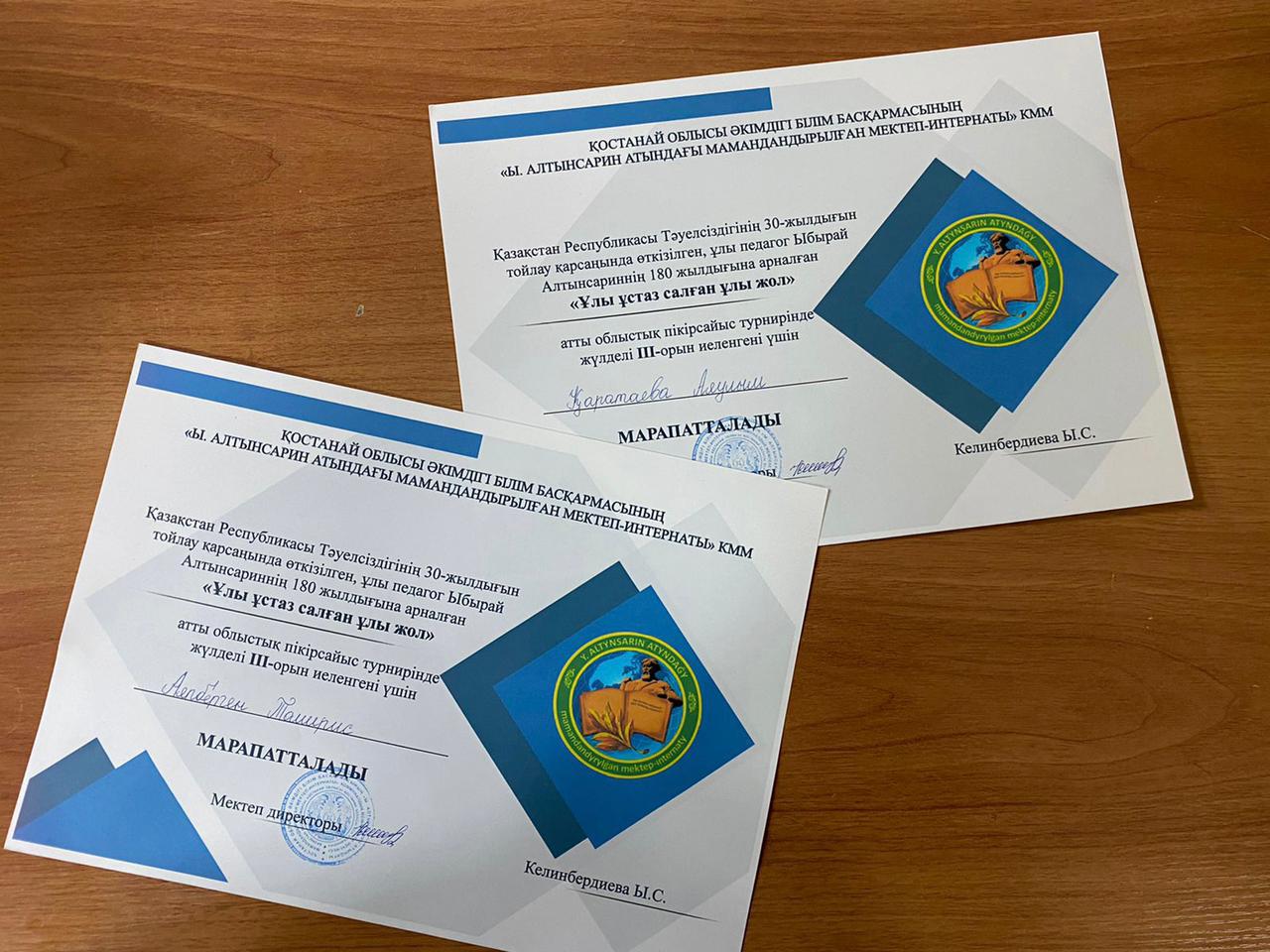 27 ноября 2021 года на базе школы для одаренных детей имени И. Алтынсарина прошёл областной дебатный турнир, в котором приняли участие учащиеся Карасуской общеобразовательной школы с государственным языком обучения Каратаева Аяулым и Аяпберген Томирис.