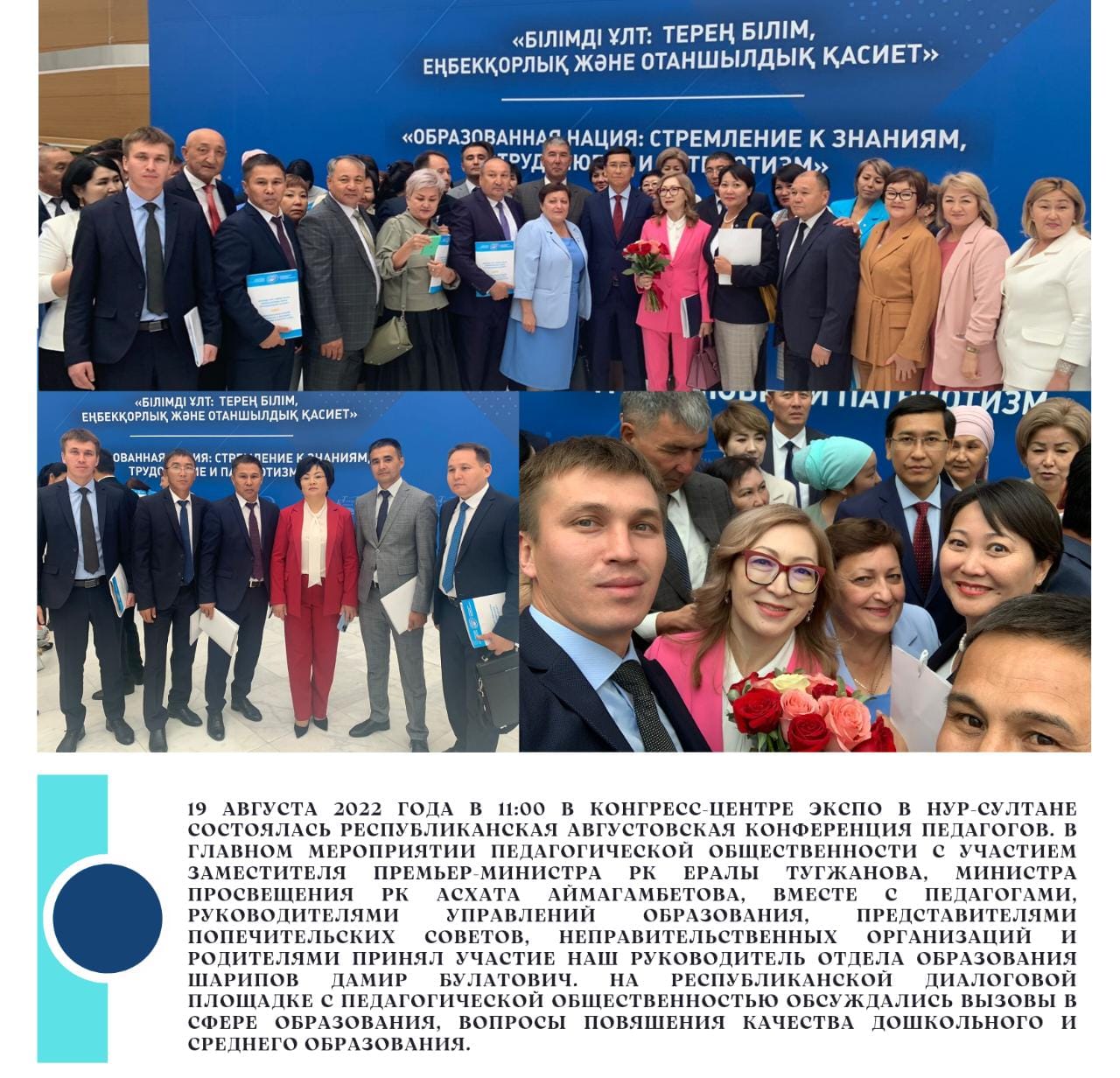 В главном мероприятии педагогической общественности с участием заместителя премьер-министра РК Ералы Тугжанова, министра просвещения РК Асхата Аймагамбетова, вместе с педагогами, руководителями управлений образования, представителями попечительских советов, неправительственных организаций и родителями принял участие наш руководитель отдела образования Шарипов Дамир Булатович. На Республиканской диалоговой площадке с педагогической общественностью обсуждались вызовы в сфере образования, вопросы повышения качества дошкольного и среднего образования.