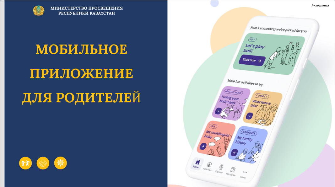 Мобильное приложение предоставляет для родителей, воспитывающих детей в домашних условиях, легкодоступные короткие практические активности по здоровью и питанию, воспитанию, развитию творческих и коммуникативных навыков, играм и взаимоотношениям. Контент предоставляет 120 идей для занятий с детьми по 10 направлениям на казахском, русском и английском языках.